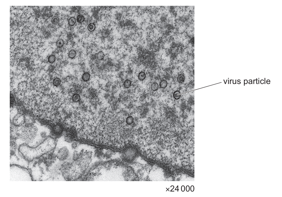 The diagram shows an electron micrograph of virus particles in a human nucleus.