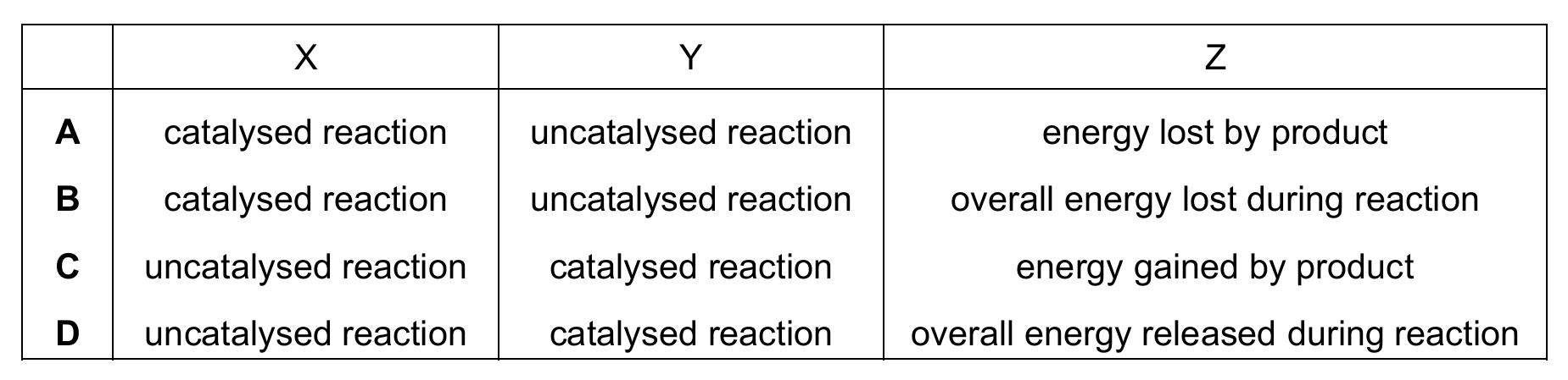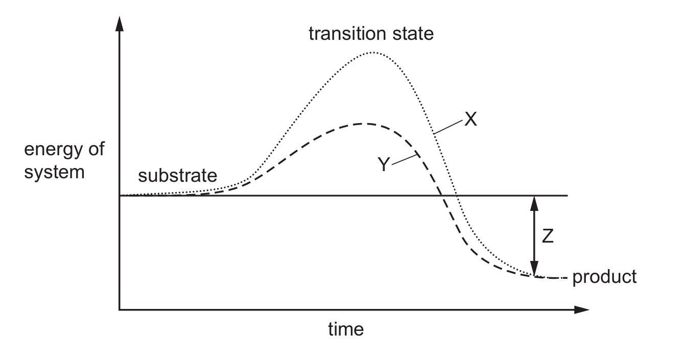 In enzyme graphs, the uncatalysed reaction (X) always has higher activation energy than the catalysed one (Y). Z represents the overall energy change (products minus reactants). The graph shows energy being released (exergonic reaction), making D correct as it matches these features.