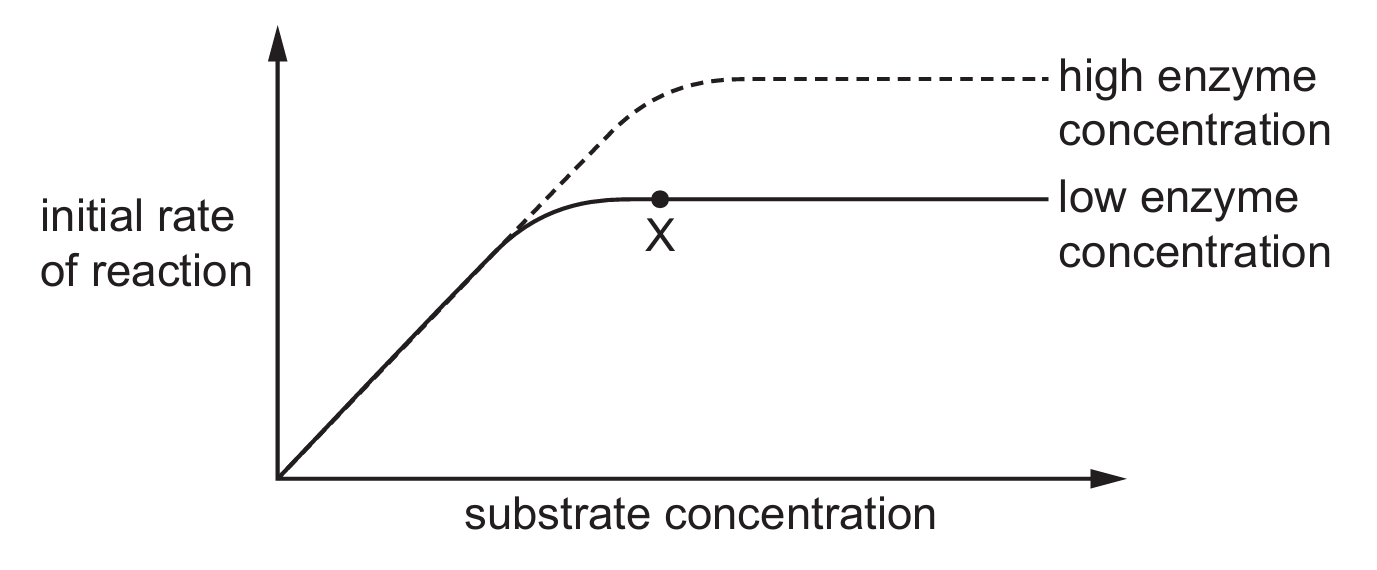 The graph shows the results of two experiments on the effect of increasing substrate concentration on the rate of an enzyme-catalysed reaction.