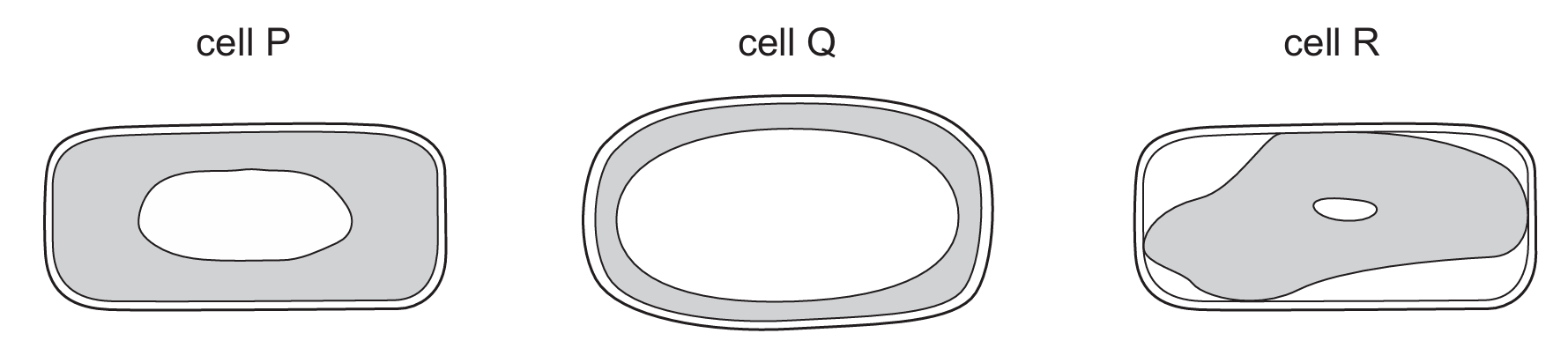Plant cells were left for 50 minutes in three different sugar solutions, 10%, 5% and 1%. The water potential in the cytoplasm of the three cells was the same at the start of the experiment.
