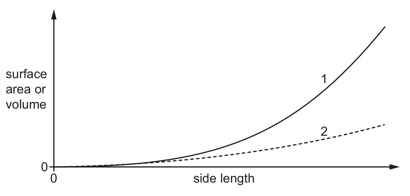 The graph shows the effect of increasing the side length of agar cubes on the surface area and the volume of the cubes.