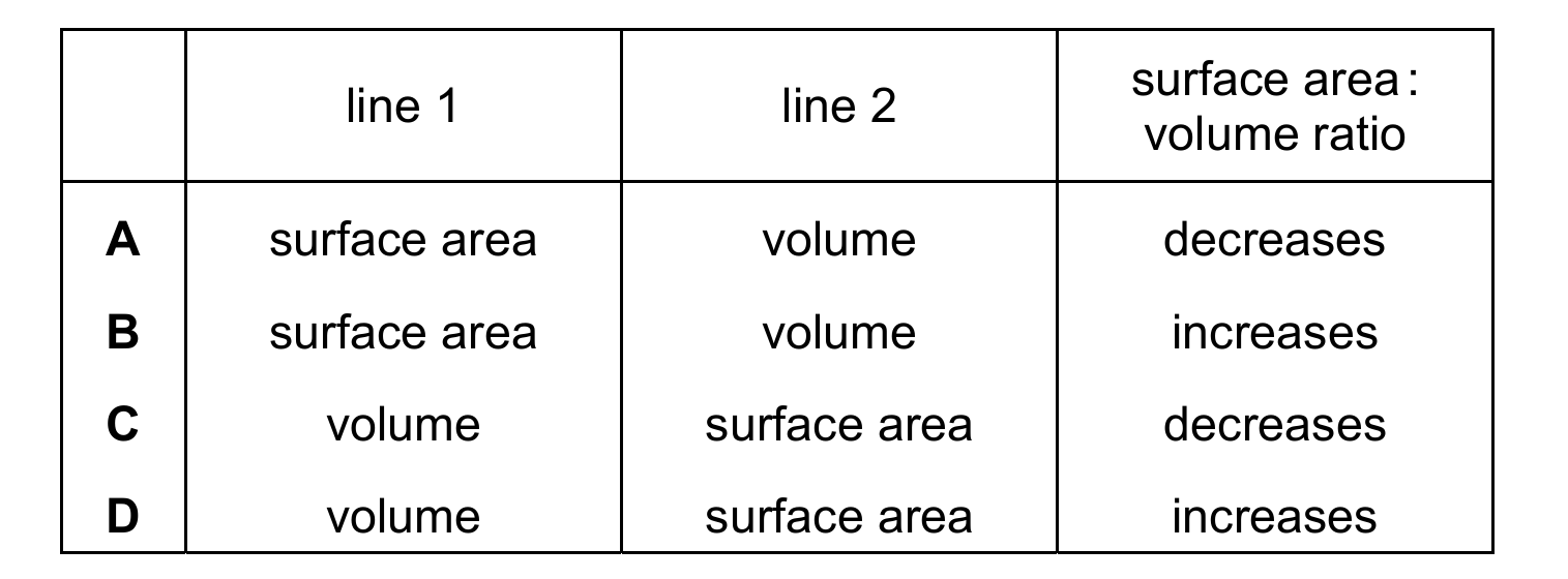 Volume increases faster than surface area as side length increases (volume ∝ L³, surface area ∝ L²). Therefore, line 1 is volume and line 2 is surface area. As size increases, the surface area:volume ratio decreases, making C the correct choice.
