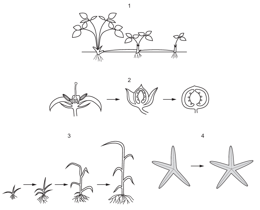 All diagrams show mitosis roles: (1) growth, (2) repair, (3) asexual reproduction, and (4) embryonic development. Mitosis is responsible for producing genetically identical cells in all these processes, making A the correct answer.