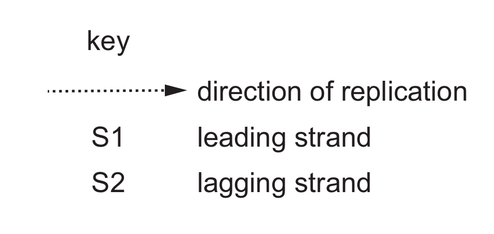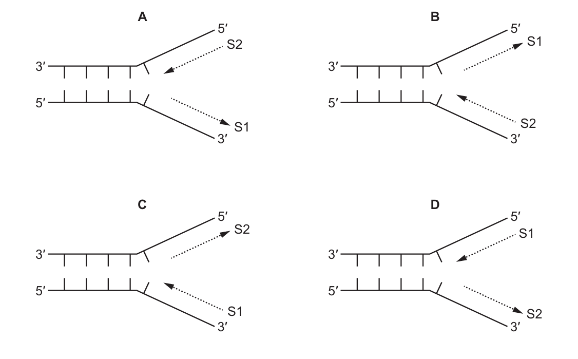 The correct diagram must show: antiparallel strands, leading strand continuous (S1), lagging strand as Okazaki fragments (S2), and replication forks moving in opposite directions. Only option C shows all these features correctly.