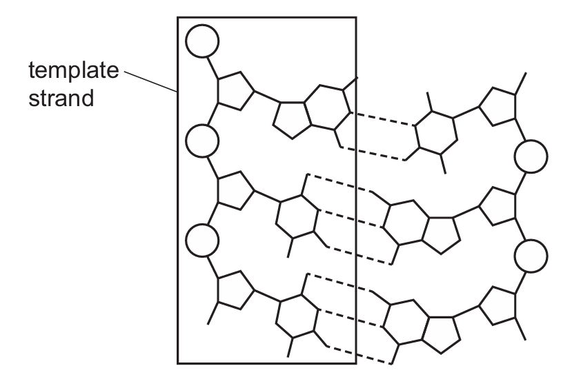 The diagram shows a section of DNA coding for one amino acid. The template strand is outlined in a box and the DNA base sequence is read in the 5′ to 3′ direction.