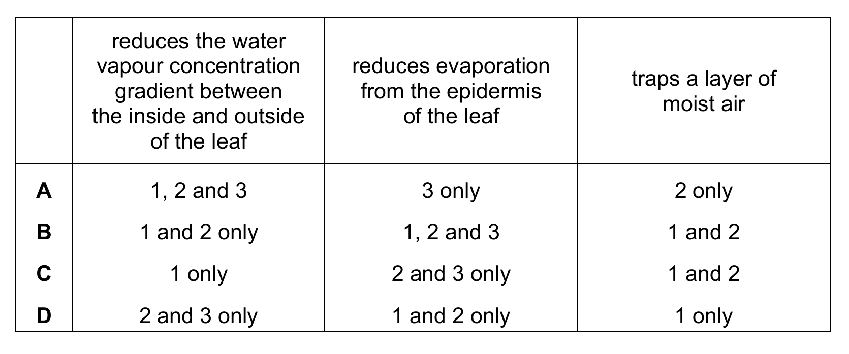 Xerophytes have multiple adaptations: stomatal pits (1) and hairs (2) reduce water vapor gradient, thick cuticle (3) reduces evaporation, and both hairs and pits trap moist air. Option B correctly matches all these functions to the structures.