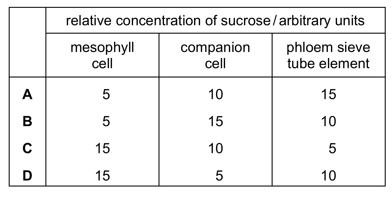 Sucrose is actively transported from mesophyll cells (low concentration, e.g., 5) into companion cells (high concentration, e.g., 15) using ATP. It then moves into sieve tube elements (medium concentration, e.g., 10) via diffusion or active transport. This creates the necessary gradient for mass flow. Thus, the correct answer is B.