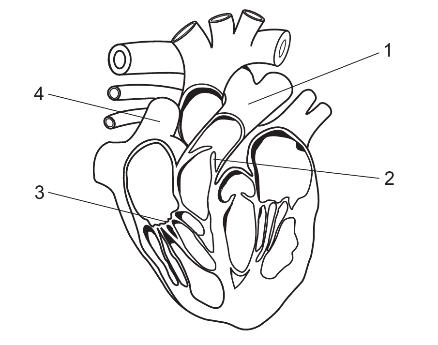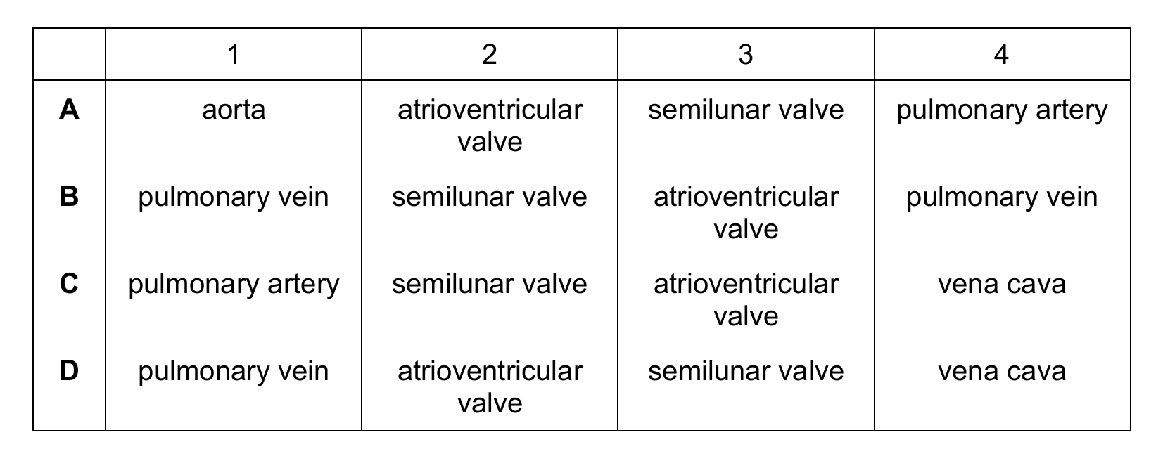 In the diagram: 1 is the pulmonary artery (carries deoxygenated blood to lungs), 2 is the semilunar valve (prevents backflow), 3 is the atrioventricular valve (e.g., bicuspid), and 4 is the vena cava (returns blood to the heart). Thus, the correct answer is C.