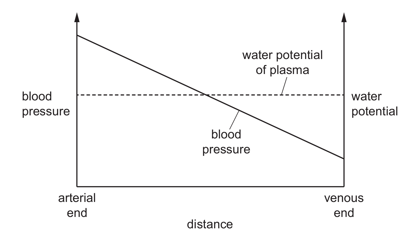 The graph shows the changes in blood pressure and water potential across a blood capillary from the arterial end of the capillary to the venous end of the capillary.