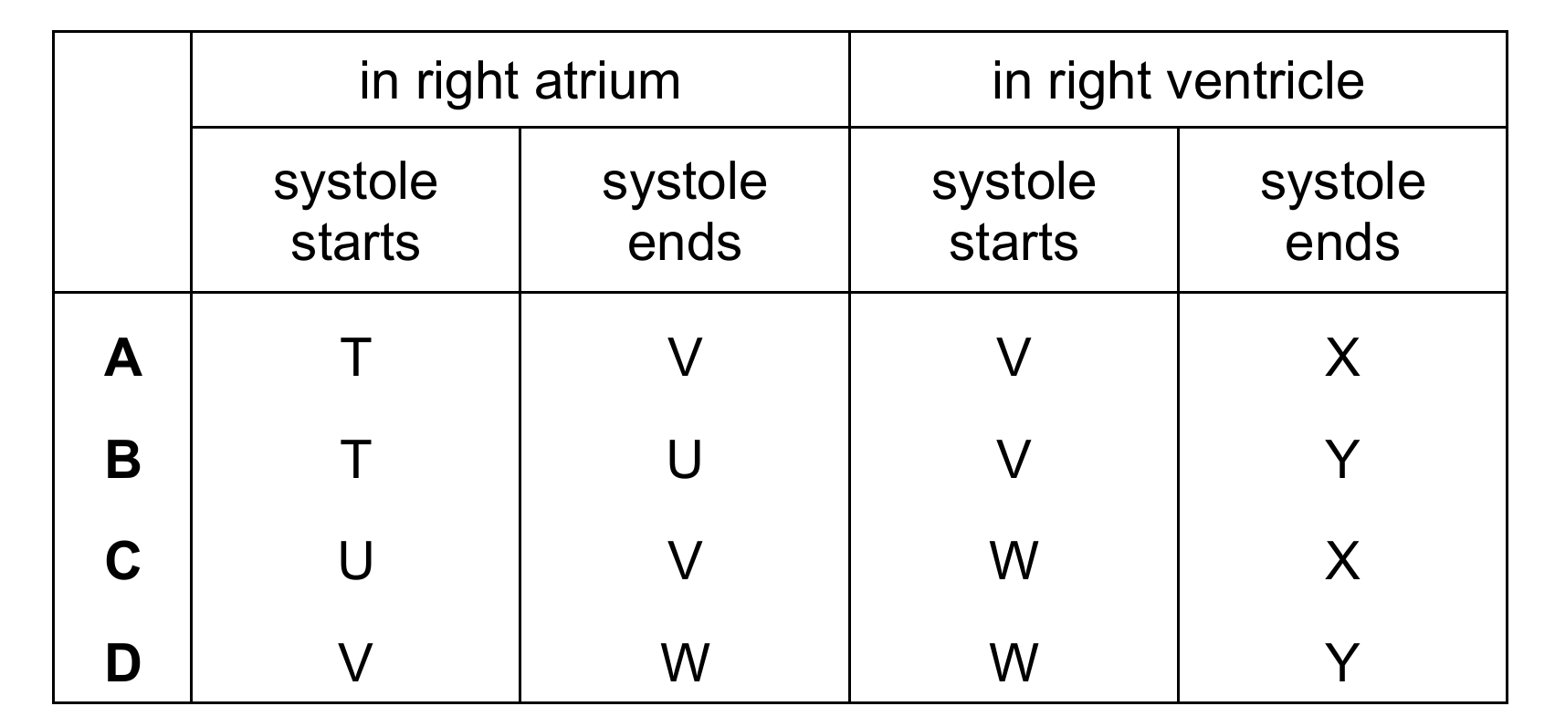 Atrial systole begins at T (P wave on ECG) and ends at V (when pressure drops). Ventricular systole starts at V (QRS complex) and ends at X (when pressure falls below aortic pressure). This matches option A perfectly.
