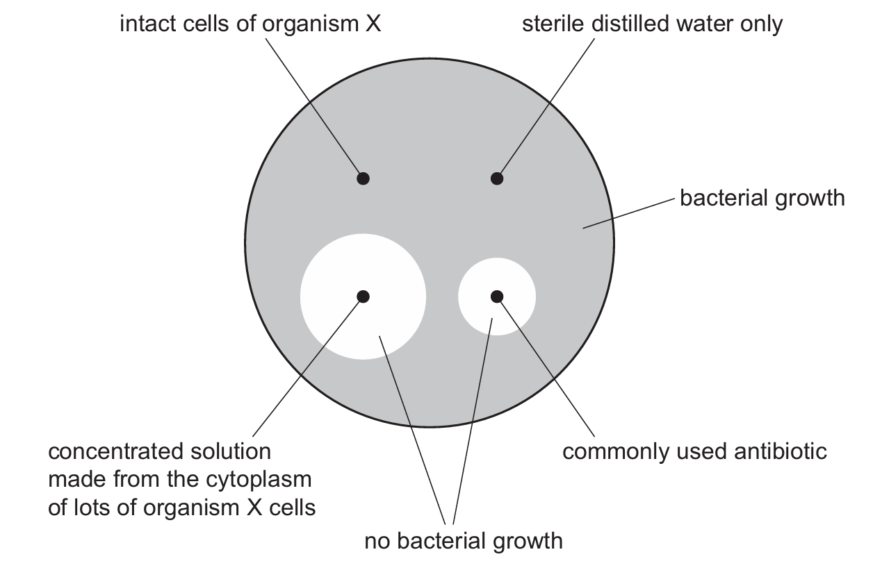 An agar plate with bacteria growing all over its surface had four wells cut into the agar. Different substances were added to each well and the agar plate with bacteria was incubated for a week.