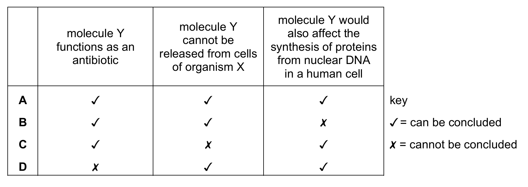 The experiment shows that intact cells of organism X didn’t inhibit bacterial growth, while the concentrated cytoplasmic solution did. This suggests Y can’t be released from intact cells (B). The antibiotic effect (A) is shown but not conclusively proven, and human ribosomes are 80S, so Y wouldn’t affect them (C).