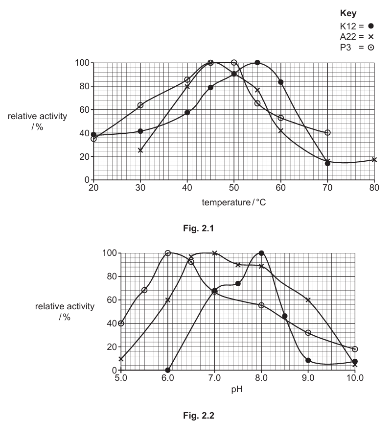 Scientists investigated whether three different keratinases, K12, A22 and P3, were suitable as industrial enzymes. These enzymes were extracted from three different soil bacteria. The effects of temperature and pH on the activity of each keratinase were investigated.