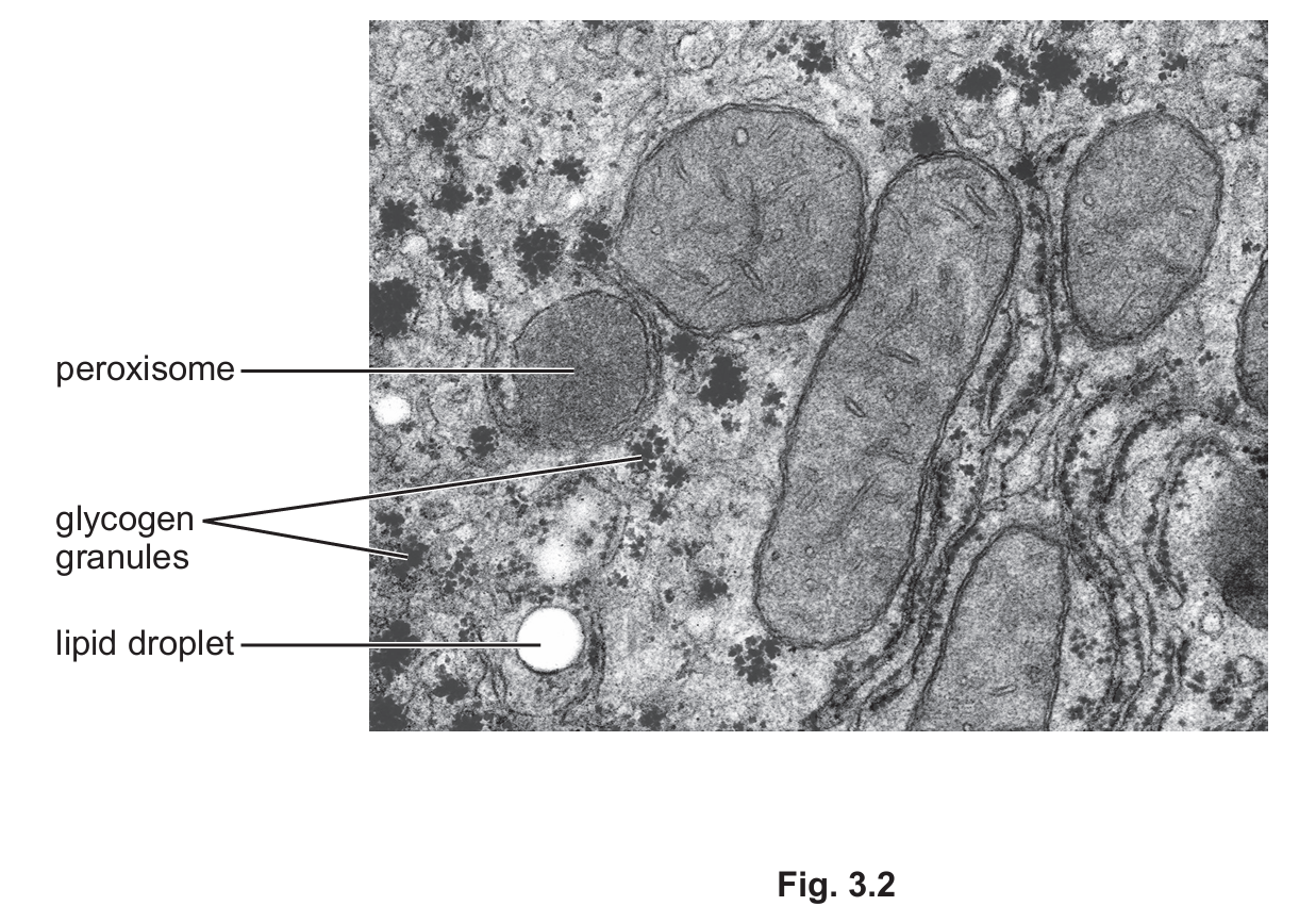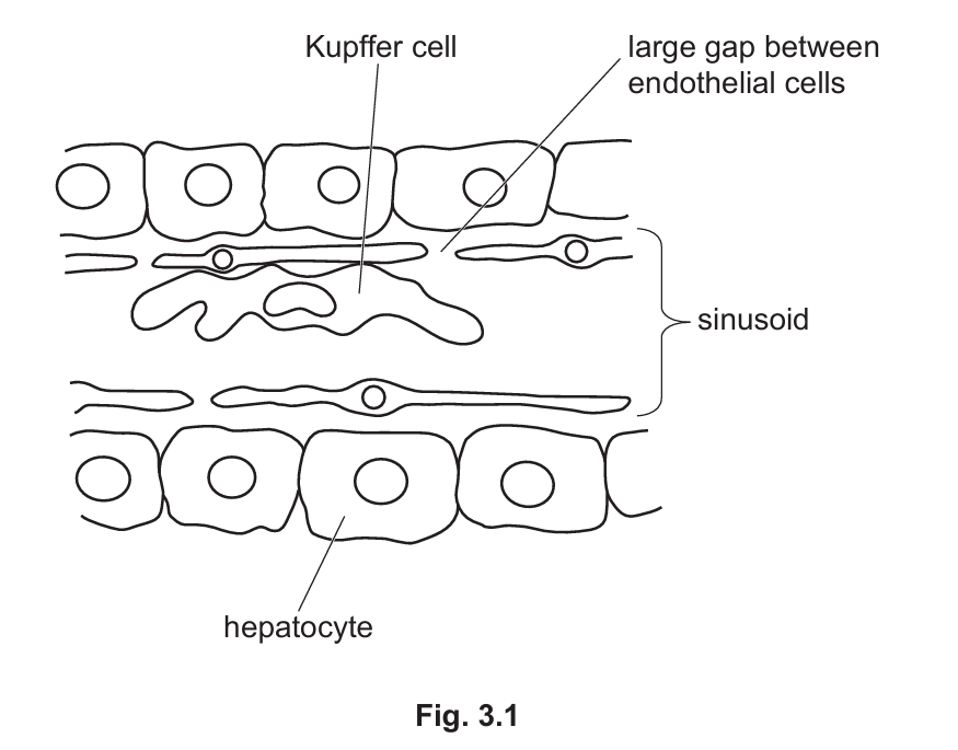 Fig. 3.1 is a diagram of part of a sinusoid and surrounding hepatocytes. A second type of cell found in the liver, a Kupffer cell, is also shown.
