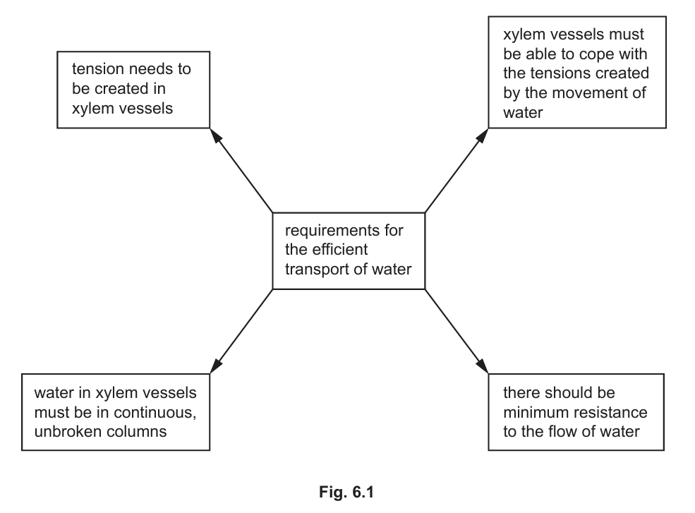 Fig. 6.1 shows four important requirements for the efficient transport of water from the roots to the leaves of a plant.