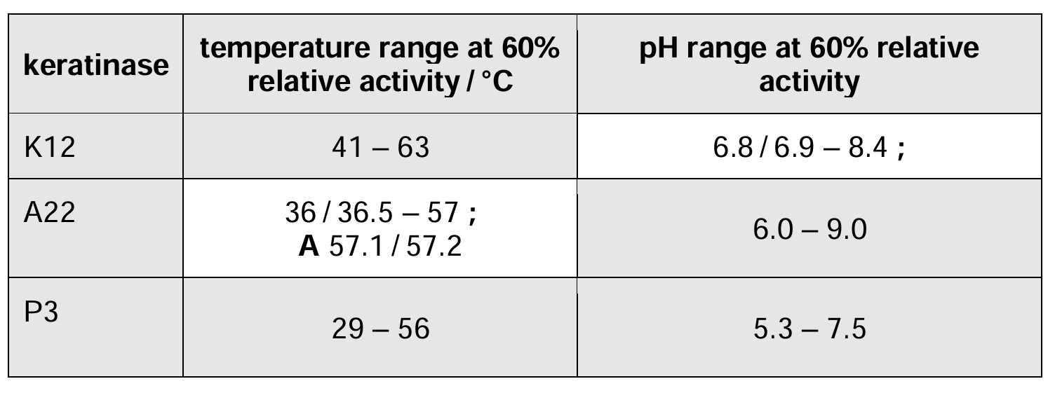 Table 2.1 shows, for each keratinase, the working range of temperature and pH where at least 60% relative activity is obtained.