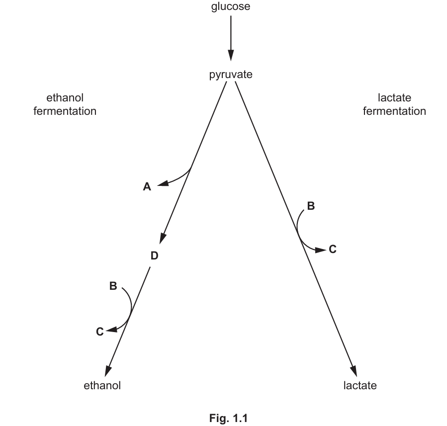 Explanation: In ethanol fermentation (yeast and plants), pyruvate is decarboxylated to produce CO₂ (A) and acetaldehyde, which is then reduced by NADH (B) to form ethanol (D), regenerating NAD⁺ (C). In lactate fermentation (mammals), pyruvate is directly reduced by NADH to form lactate, regenerating NAD⁺.