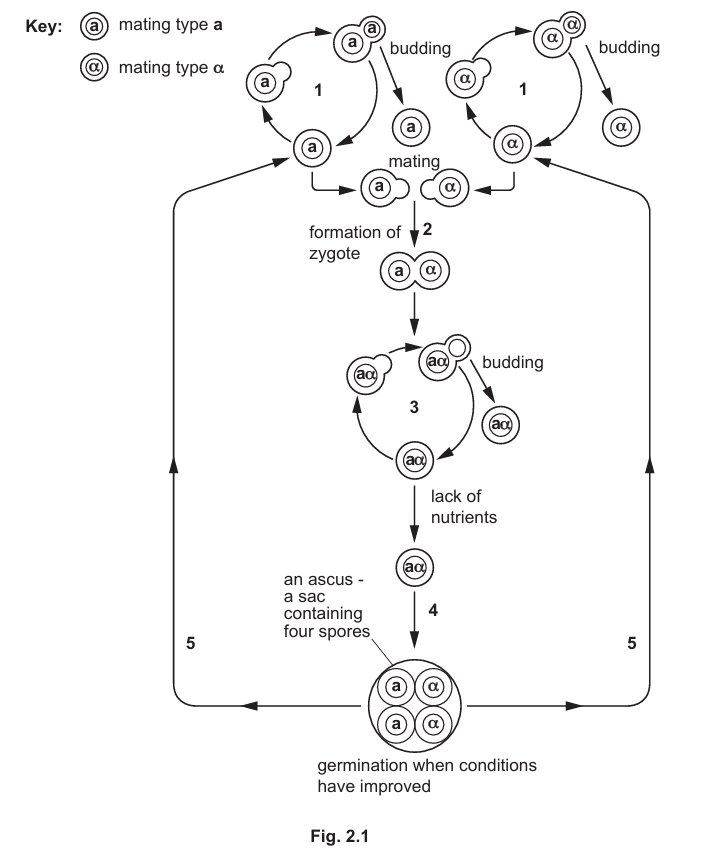 Explanation: Mitosis occurs during budding (stages 1 and 3) where identical daughter cells are produced. Meiosis occurs during spore formation (stage 4) to produce haploid spores. Genetic variation arises from sexual reproduction (stage 2 – mating) and meiosis (stage 4). Haploid cells are present in stages 1 (budding of haploids) and 5 (germinated spores), while diploid cells are only present in stage 3 (budding of diploids).