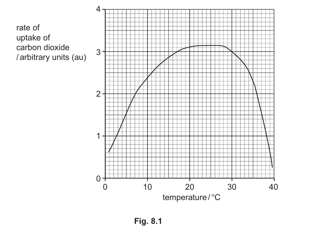 (c) Fig. 8.1 shows how the rate of uptake of carbon dioxide by a plant varies with temperature, at an optimum intensity of light on a clear day.
