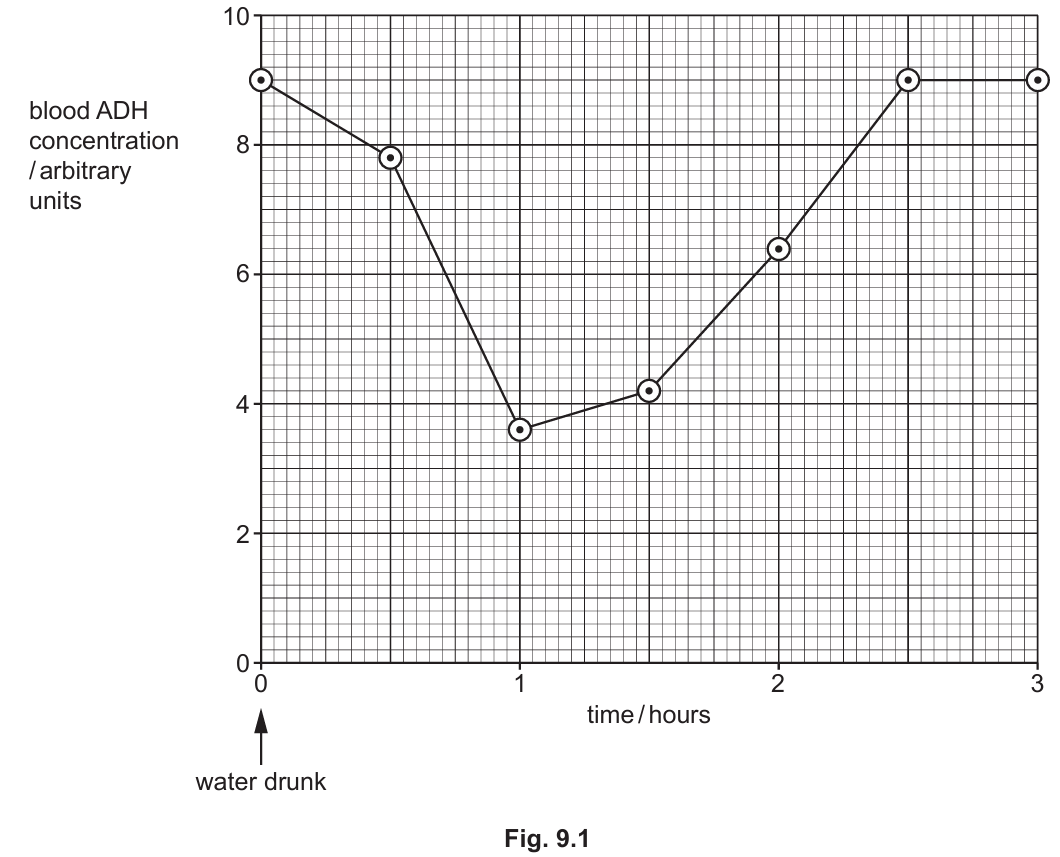 A student drank 0.5 dm3 of water and the concentration of ADH in their blood was measured every 30 minutes for 3 hours.