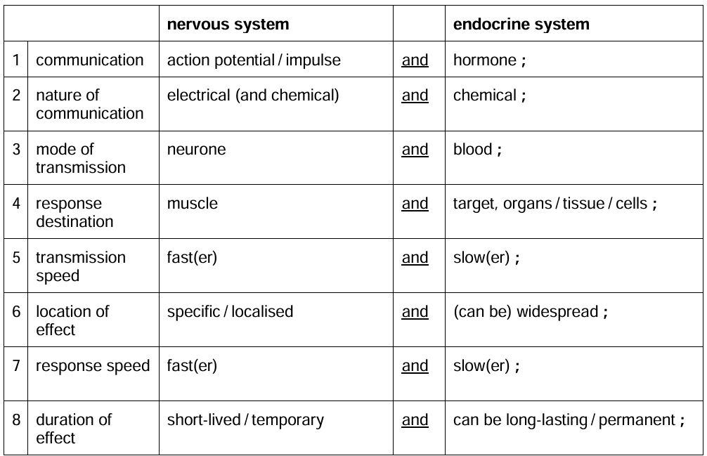 The nervous system uses electrical impulses along neurons and chemical signals at synapses. It’s extremely fast (allowing for instant reactions) but short-lived, perfect for immediate responses like moving away from danger.