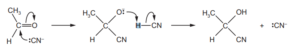 Ethanal and hydrogen cyanide react together. The reaction mechanism involves cyanide ions