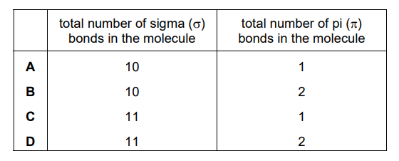Methylpropene (\(C_4H_8\)) has a double bond between two carbons and single bonds elsewhere. The total number of covalent bonds is 11 (4 C-C bonds and 7 C-H bonds). The correct row in the table is C, which matches this count.