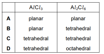 In the dimeric form (Al₂Cl₆), aluminium is tetrahedral (4 bonding pairs) due to coordinate bonds from chlorine bridging atoms. In the monomeric form (AlCl₃), aluminium is trigonal planar (3 bonding pairs) as it lacks a lone pair and forms 3 covalent bonds. This matches option B.