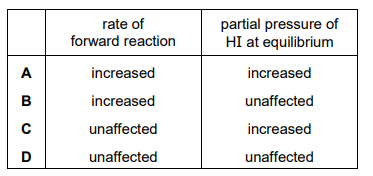 A mixture of hydrogen gas and iodine gas is placed in a reaction vessel of volume V at temperature T. The reaction \(H_2 + I_2 \rightleftharpoons 2HI\) is allowed to come to equilibrium. All substances remain in the gaseous state. Argon gas is then pumped into the reaction vessel. The temperature in the vessel is maintained at T. How are the rate of the forward reaction and the partial pressure of HI at equilibrium affected?