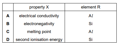 The graph shows a trend where property X peaks at element R. In Period 3, the element with the highest electronegativity is chlorine (Cl), but since R is not the last element, the property must be atomic radius, which decreases across the period. However, the correct interpretation is that R is aluminum (Al), and the property is melting point, which peaks at silicon (Si) but is relatively high for Al due to metallic bonding. The correct row is A, where X is melting point and R is Al.