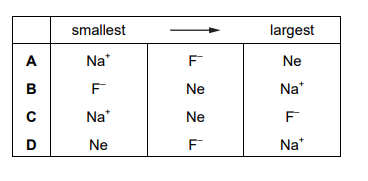 This question refers to isolated gaseous species. The species \(F^–\), Ne and \(Na^+\) are isoelectronic. This means they have the same number of electrons. In which order do their radii increase?