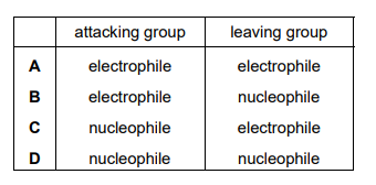 In the hydrolysis of bromoethane by aqueous NaOH, what is the nature of the attacking group and of the leaving group?