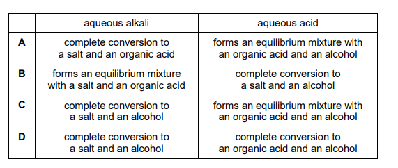 Esters can be hydrolysed with an aqueous alkali or an aqueous acid to form two products. The table compares the two methods. Which row is correct?