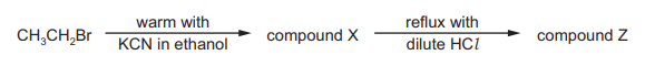 3. The alkyl bromide then undergoes hydrolysis (reaction with water) to form \( CH_3CH_2OH \), which is further oxidized to \( CH_3CH_2COOH \) (propanoic acid).
