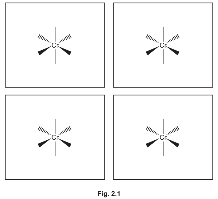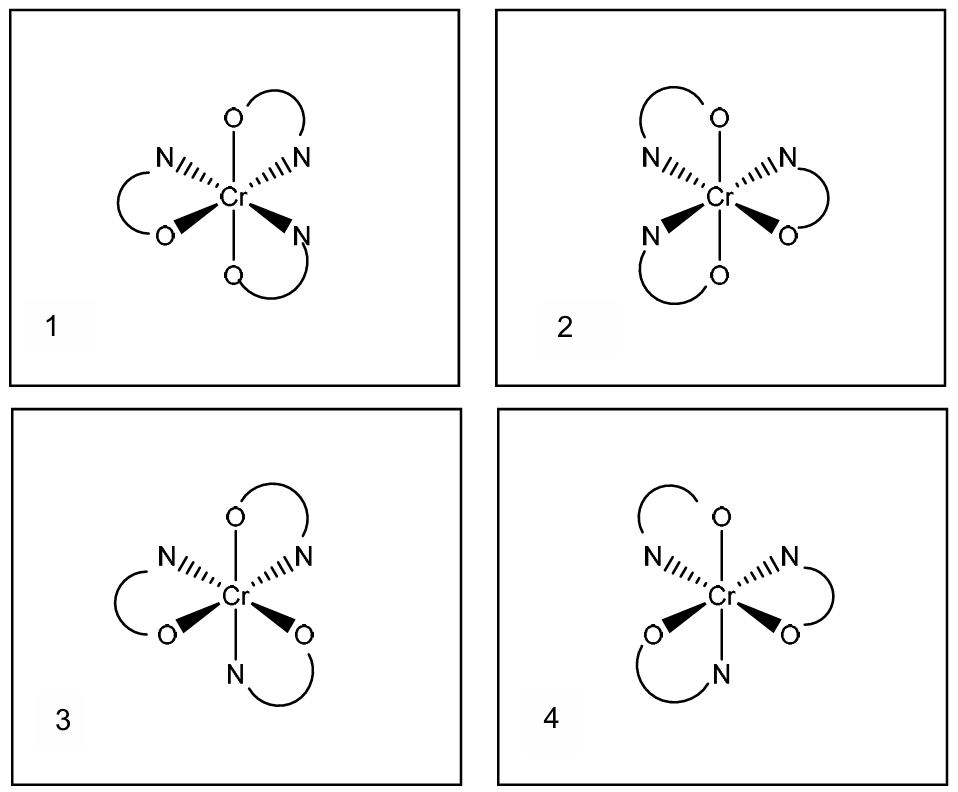 Complete the three-dimensional diagrams in Fig. 2.1 to show the four stereoisomers of \([Cr(OCH_2CH_2NH_2)_3]^{-}\).