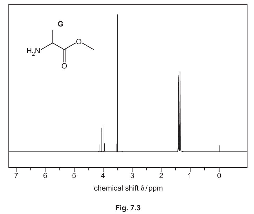– δ 1.4: The 3H in the \( \ce{-CH3} \) group of the alanine side chain. It is split by the one adjacent methine proton (H-C-) into a doublet (n+1 = 3+1=4? Wait, n is the number of adjacent H, which is 1, so splitting is n+1 = 2, a doublet). The mark scheme confirms doublet.