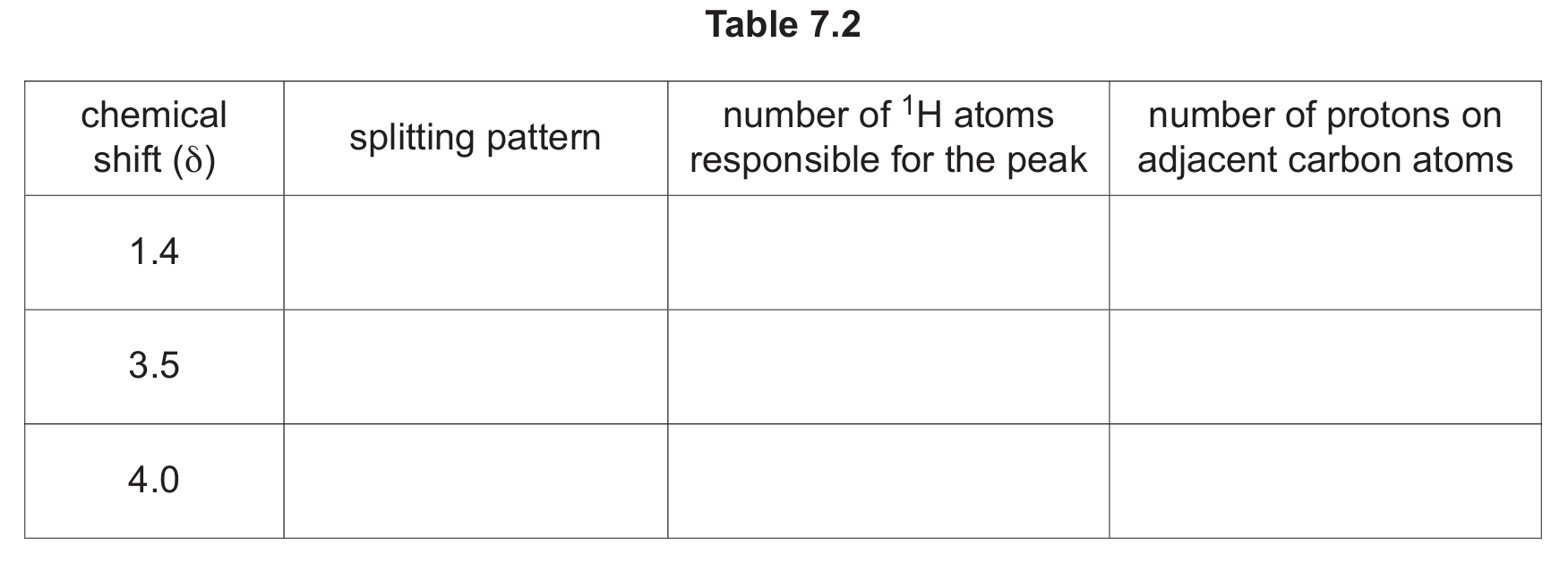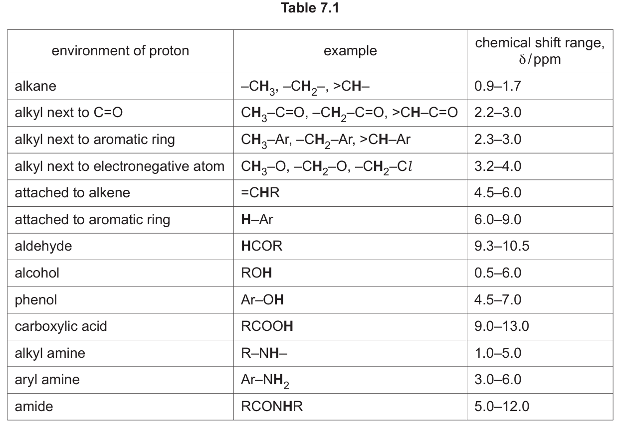 | chemical shift (δ) | splitting pattern | number of \(^{1}\ce{H}\) atoms | adjacent protons (n) |