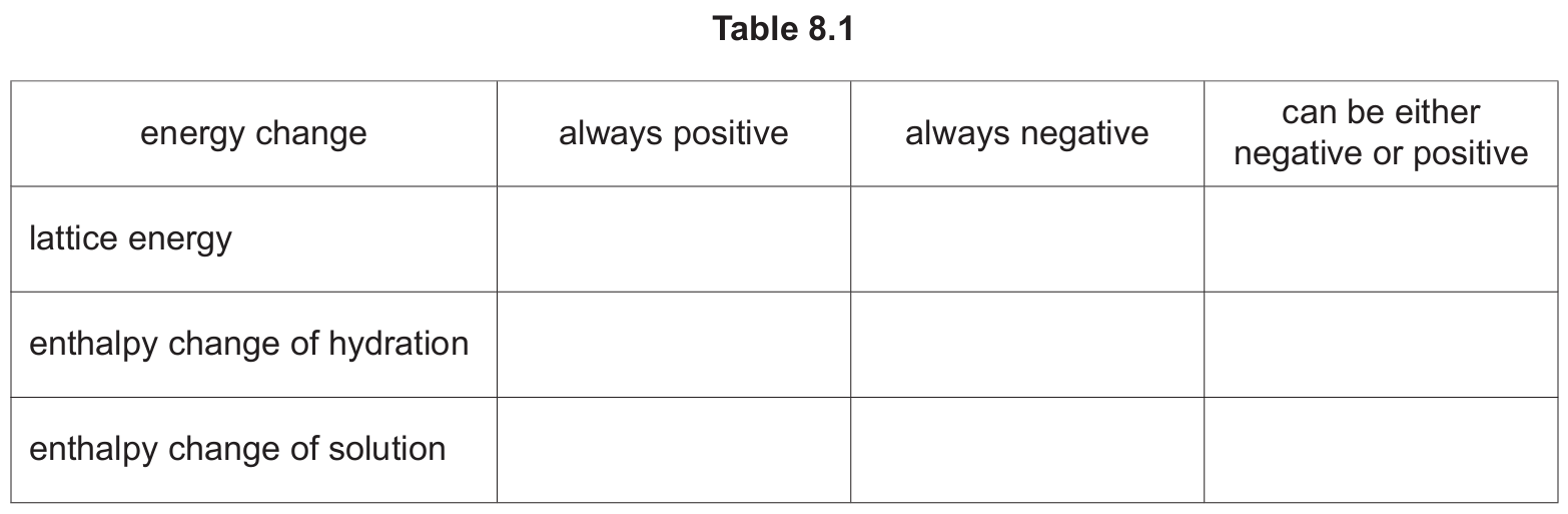 (a) Complete Table 8.1 by placing one tick (✓) in each row to indicate the sign of each type of energy change under standard conditions.
