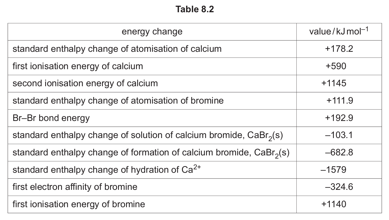 (i) Select and use relevant data from Table 8.2 to calculate the lattice energy, \( \Delta H^{\ominus}_{\text{latt}} \), of CaBr2(s). It may be helpful to draw a labelled energy cycle. Show your working.