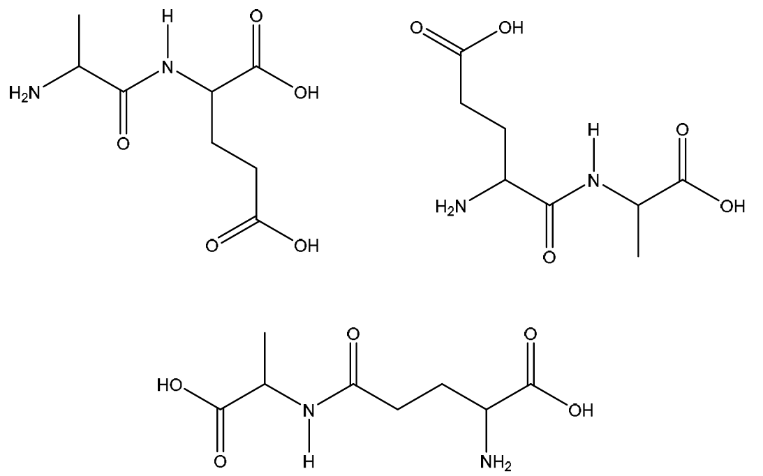 Explanation: The dipeptide ala-glu is formed by a condensation reaction between the carboxylic acid group of alanine and the amine group of glutamic acid (or vice versa; the name ‘ala-glu’ implies alanine’s N-terminus and glutamic acid’s C-terminus). A peptide bond ( -CO-NH- ) is formed, and a water molecule is eliminated. The structure should show the peptide bond clearly, with the remaining functional groups (the extra carboxylic acid on glutamic acid’s side chain) intact.