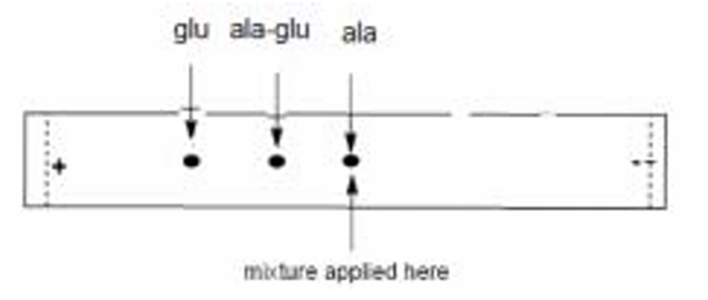 – The dipeptide ala-glu will have a pI between that of alanine and glutamic acid. At pH 6.0, which is above its pI, it will also have a net negative charge and move towards the anode. However, because it has a higher molecular mass and only one extra negative charge (from Glu’s side chain) compared to the two negative charges on free glutamic acid, it will experience a weaker force per unit mass and will likely move slower and a shorter distance than free glutamic acid.