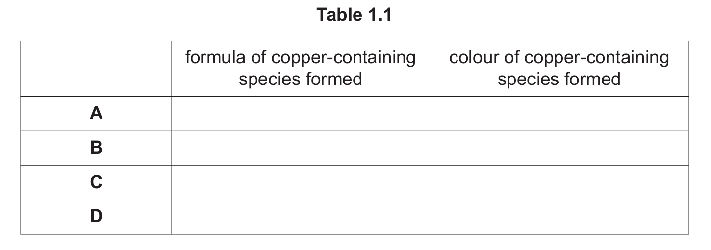 Complete Table 1.1 to show the formula and colour of each of the copper-containing species present in A, B, C and D.