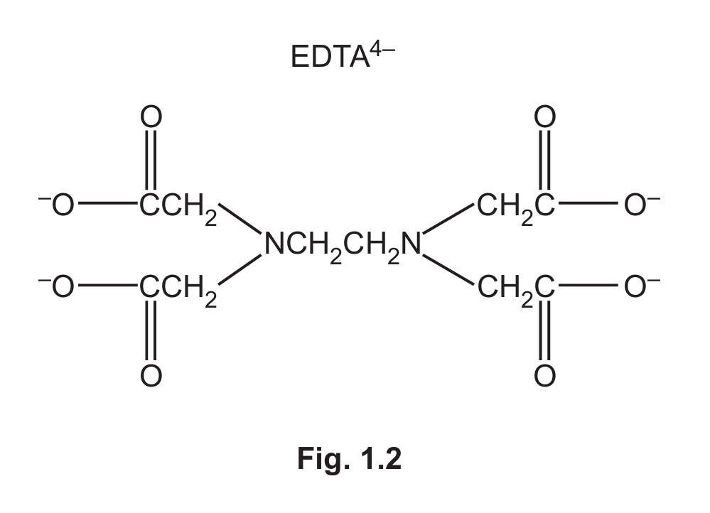 Circle on the structure of EDTA⁴⁻ in Fig. 1.2 the six atoms that form bonds with the metal ion.