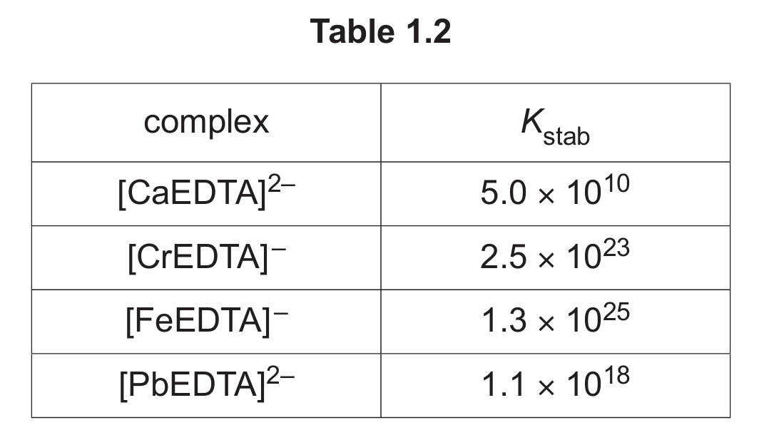 Table 1.2 shows the numerical values for the stability constants, Kstab, for some metal ions with EDTA⁴⁻.