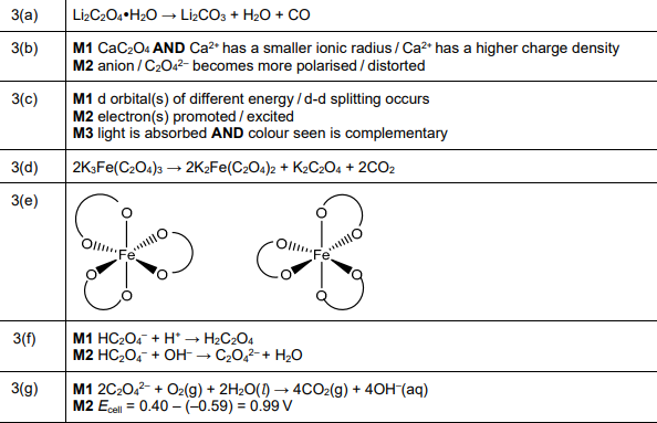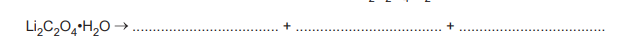 (a) When a sample of hydrated lithium ethanedioate, Li₂C₂O₄•H₂O, is gently heated, two gaseous products are formed and a white solid residue remains. The residue is added to HNO3(aq). A gas is produced that turns limewater milky. Complete the equation for the decomposition of Li₂C₂O₄•H₂O.![]()
