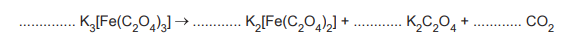 (d) \(\text{2K}_3[\text{Fe}(\text{C}_2\text{O}_4)_3] \rightarrow \text{2K}_2[\text{Fe}(\text{C}_2\text{O}_4)_2] + \text{K}_2\text{C}_2\text{O}_4 + \text{2CO}_2\)