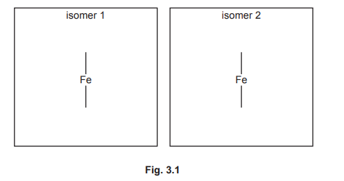 (e) The \([Fe(C_2O_4)_3]^{3–}\) complex ion shows stereoisomerism. Complete the three-dimensional diagrams in Fig. 3.1 to show the two stereoisomers of \([Fe(C_2O_4)_3]^{3–}\). The \(C_2O_4^{2–}\) ligand can be represented using