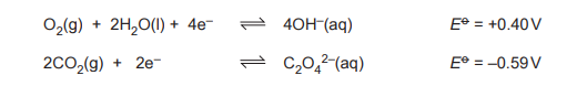 (g) A fuel cell is an electrochemical cell that can be used to generate electrical energy by using oxygen to oxidise a fuel. Ethanedioic acid, (COOH)₂, dissolved in an alkaline electrolyte, is being investigated as a fuel. The relevant standard electrode potentials, \(E^\Theta \), for the cell are shown.