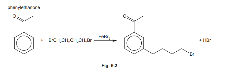 \(\text{BrCH}_2\text{CH}_2\text{CH}_2\text{CH}_2\text{Br} + \text{FeBr}_3 \rightarrow \text{BrCH}_2\text{CH}_2\text{CH}_2\text{CH}_2^+ + \text{FeBr}_4^-\)