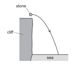 A stone is thrown horizontally from the top of a cliff and falls into the sea below. Air resistance is negligible. The path of the stone is shown.